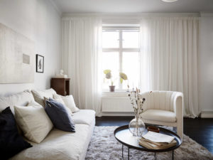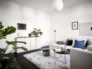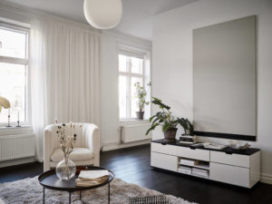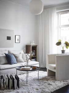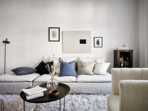 Dnevni boravak na fotografijama niti malo ne djeluje dosadno iako njime dominira bijela, a za to su zaslužne ponajviše teksture. Tepih visokog flora, dizajnerski stalak za novine nepravilnog oblika, lanena tkanina na sofi, te predivan naslonjač dizajnerskog dua Space Copenhagen za &tradition, Loafer CS23.