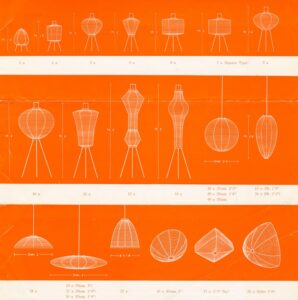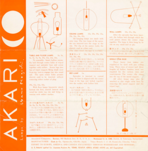…Akari has its rationale in being in relation to people … I was told early on that all a young couple needed in starting life together was a ‘futon’ and an Akari above—a pad and a light, that is, not only just light, but the Akari light which is a difference because it has a shape, a sense of being which is more than merely lighting a room, it is lighting itself, that is, the paper of which the Akari is made becomes luminous as a result of the light inside, on its surface, however distant the light may be from the light bulb, it all becomes a luminous surface.1