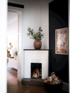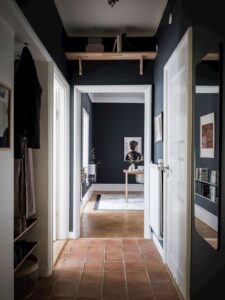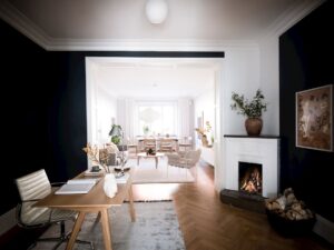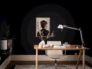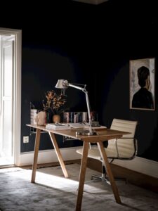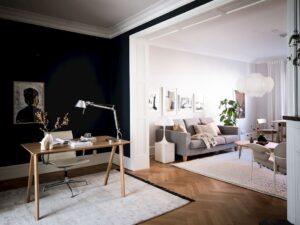 U ovome slučaju radna soba ima i drugu funkciju, ona je pretprostor dnevnom boravku stana i da bi se nekako zoniralo prostor, zidovi su obojeni u crno. Na prvu djeluje kao veliki kontrast, ali meni osobno se jako sviđa. Dobro su izbalansirane boje, teksture i materijali.
