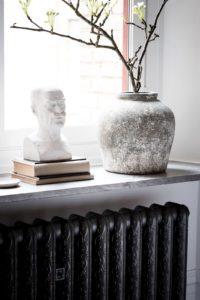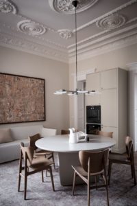 Za interijer je odabrana paleta nježnih pastelnih boja i namještaj jednostavnih silueta, vrlo suvremen i pomalo kontradiktoran vremenu iz kojega je sama zgrada, no konačni rezultat je savršeno izbalansiran interijer prilagođen životu 21. stoljeća.