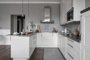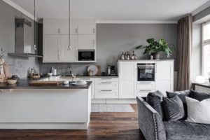Stan je vrlo zahvalnog tlocrta gdje dnevnu zonu otvorenog tipa čine kuhinja s blagovaonicom i dnevnom sobom. Njih su obukli u neutralno sivu i bijelu u kojoj je izveden i sav namještaj i drveni paneli na zidovima. Toplinu prostoru donosi bogata smeđa nijansa drvenog poda koja savršeno kontrira baznom koloritu interijera.
