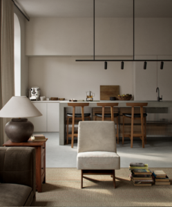 Renderi prikazuju idejni koncept dnevnog trakta koji uključuje otvoreni tlocrt dnevnog boravka te kuhinje s blagovaonskim kutkom. Iako prostor djeluje vrlo kompaktno i povezano, svaka od tih jedinica jasno je zonirana.