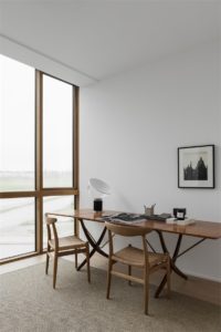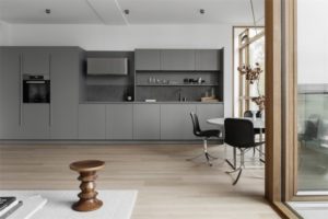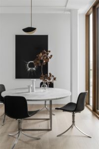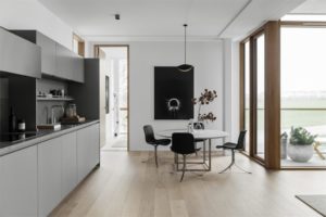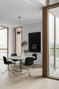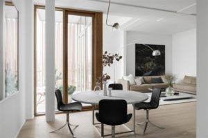 Prozračan i monokroman interijer s tek pokojim detaljem u smeđem tonu, uređen je vrlo sofisticirano i elegantno. Prirodni materijali poput drva kojim je popločen pod ili mramora i kamena koje nenametljivo nalazimo posvuda u stanu, s jednostavnim formama i oblicima čine ovaj interijer vrlo skladnom cjelinom i mjestom ugodnim za boravak. Velika količina prirodnog svjetla koja ulazi kroz staklene stijene veliki je bonus ovoga kompeksa. Dnevnom zonom dominira prostrana kutna sofa u boji pijeska te detalji u crnoj poput blagovaonskih stolica PK9 Poula Kjærholma i umjetničkih djela na zidovima.