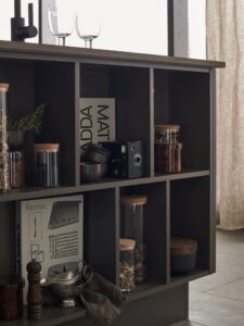 Ako pažljivije pogledate vidjet ćete da je cijela kuhinja sadržana u centralnom otoku na kojemu se priprema hrana i pere posuđe i namjernice, dok su na pokrajnjim zidovima smještene otvorene police i ormar s hladnjakom. Navikli smo već na to da je kuhinja centralno mjesto druženja, nije to ništa novo, pa je tako i ova podređena upravo druženju, pripremi i uživanju u hrani.