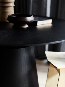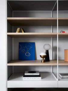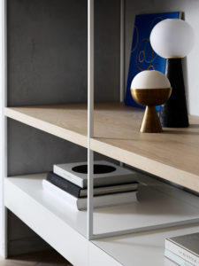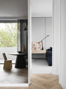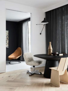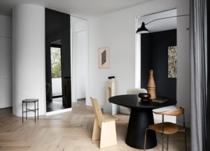 Interijerom dominiraju smione asimetrične linije i objekti koji grade dubinu i dramu stvarajući prostor koji slavi dizajn i umjetnost. Neki od proslavljenih komada koje možemo zamjetiti su i čuvena Wegnerova stolica pp701 znana i kao Minimal Chair iz 1965. godine, lampa francuskog dizajnera Sergea Mouillea, lanterne NEO studija Apparatus ili betonski stolić Kreten koji je dizajnirao Isaac Friedman-Heiman. Svaki od tih komada ispunjava stan svojom osobnošću stvarajući suvremenu minimalističku oazu.