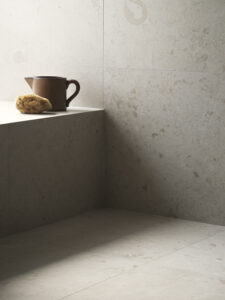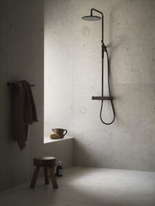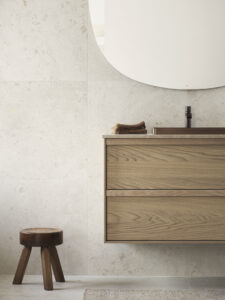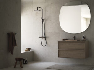 Predstavili su ideju za minimalističku kupaonicu s pločicama Norrvange Ivory koje kao baza savršeno odgovaraju detaljima u drvu i smećkasto-bakrenim tonovima za koje se odlučila Pella.
