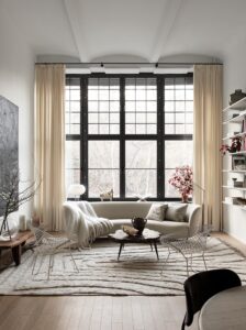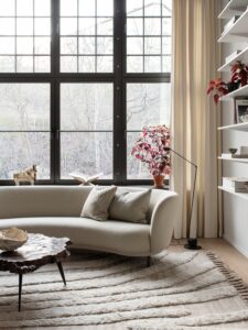 Dnevnim boravkom dominira sofa Dandy švedskog brenda Massproductions koju je za njih 2015. godine dizajnirao Chris Martin, a počiva na debelom ručno rađenom tepihu brenda Cappelen Dimyr koji svoje tepihe izrađuju u Indiji tradicionalnim tehnikama.