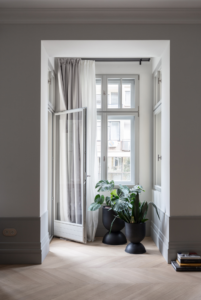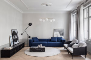 Cijela slika “romantike” prostora ublažena je vrlo neutralnim koloritom i komadima namještaja vrlo minimalističkih i jednostavnih formi i oblika među kojima možemo prepoznati rasvjetna tijela londonskog dizajnera Tima Rundlea za Menu, mramorni stolić istog brenda, upečatljivu sofu u plavoj boji za koju dizajn potpisuje Didier Gomez za Ligne roset, Masculo blagovaonske stolice danskog brenda Gubi ili vrlo popularne cvjetnjake Hourglass iz Ferm Livinga.