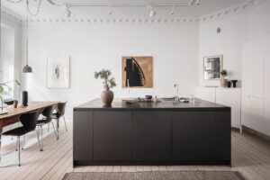 Minimalistička crna kuhinja, odnosno veliki pravokutni crni otok u kojemu je smješten svaki element koji čini kuhinju zaista plijeni pažnju. Suvremen, robustan, upečatljiv. Detalj koji dominira.