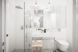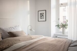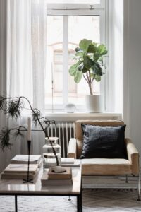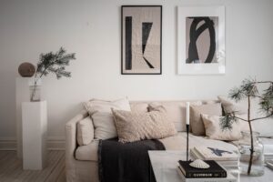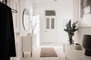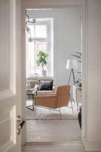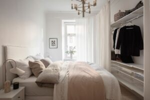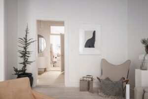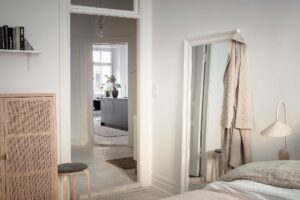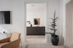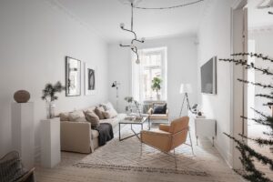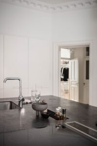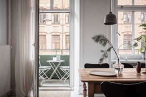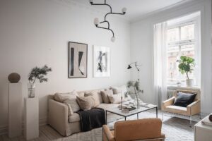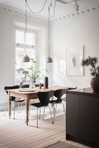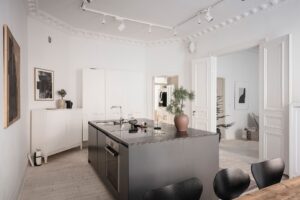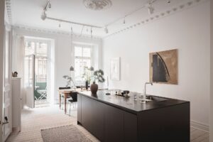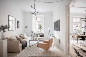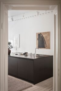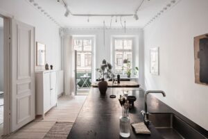 Ovaj primjer odličan je i kao inspiracija svima koji nemaju priliku u stanu napraviti otvoreni tlocrt dnevnog trakta. Arhitektura zgrade ponekad ne dozvoljava takve građevinske preinake pa moramo biti maštoviti i “otvoriti” prostor na druge načine. Velika bijela dvokrilna vrata koja su poveznica između kuhinje i dnevnog boravka svojevrstan su i ukras koji se stapa s bijelim zidovima i čini prostor prohodim i svijetlim. Zgrade visokih stropova zaista imaju svoju čar.