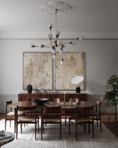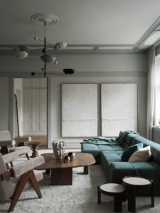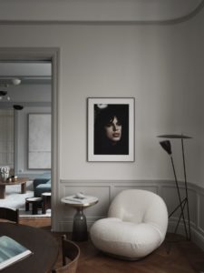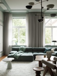 U vrlo neutralnom pastelnom koloritu stana ističe se divna sofa Patricije Urquiole za talijanski brend B&B Italia u zelenoj boji. Neki od upečatljivih komada namještaja koje još možemo primijetiti su i klupski stolić od masiva drva za koji dizajn potpisuje Niklas Runesson, zidna umjetnička djela Jareda Greena, naslonjači Pierrea Jeannereta, Eamesov stolić Model A iz serije Mini, okrugli stolići Marema talijanskog dizajnera Gianfranca Frattinija za Cassinu, keramika švedske dizajnerice i keramičarke Sofije Tufvasson itd.